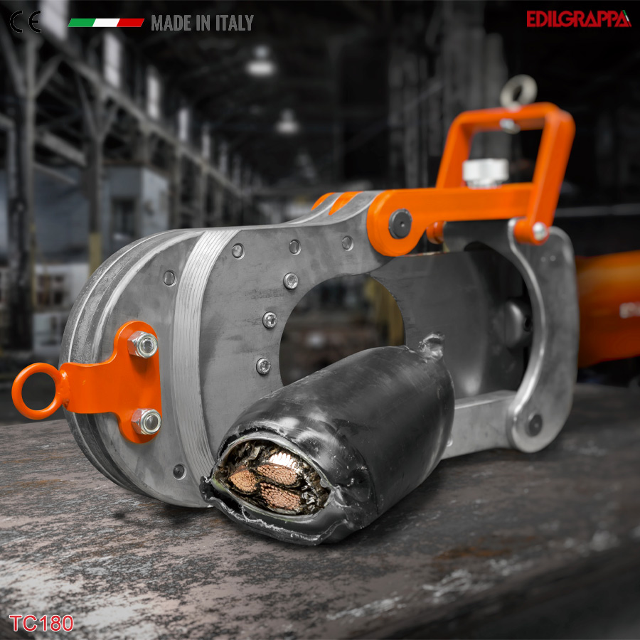 Edilgrappa TC180 là máy cắt cáp điện công nghiệp hạng siêu nặng, vận hành bằng điện, có khả năng cắt cáp đến Ø 180 mm. Thiết bị tạo lực cắt cực đại 792 kN (≈ 80,7 tấn) với xy lanh tác động kép, đáp ứng yêu cầu cắt dây cáp khổ lớn trong các dự án điện lực và hạ tầng